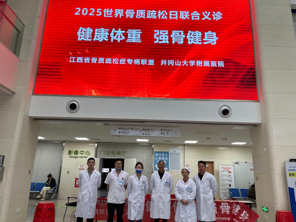 2025年世界骨质疏松日主题为“健康体重,强骨健身”,呼吁公众通过均衡营养、合理锻炼、保持适宜体重,以及高危人群早筛查早防治等方法维护骨骼健康。为响应这一主题,帮助群众做到“早筛、早诊、早治”,井冈山大学附属医院内分泌科联合骨科、疼痛科,10月22日上午在门诊大厅一楼开展“2025年世界骨质疏松日”及“世界镇痛日、中国镇痛周”公益义诊活动。