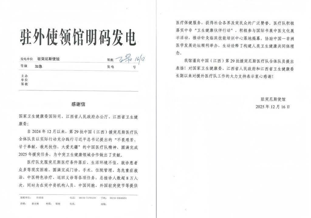 据了解,此次援外任务由国家及省、市卫生健康委统一部署。援外期间,医疗队整体工作成效显著,表现突出,集体荣获突尼斯卫生部、中华人民共和国外交部驻突尼斯共和国大使馆和中央宣传部进出口管理局分别致函表扬,充分体现了各方对医疗队工作的高度认可。
