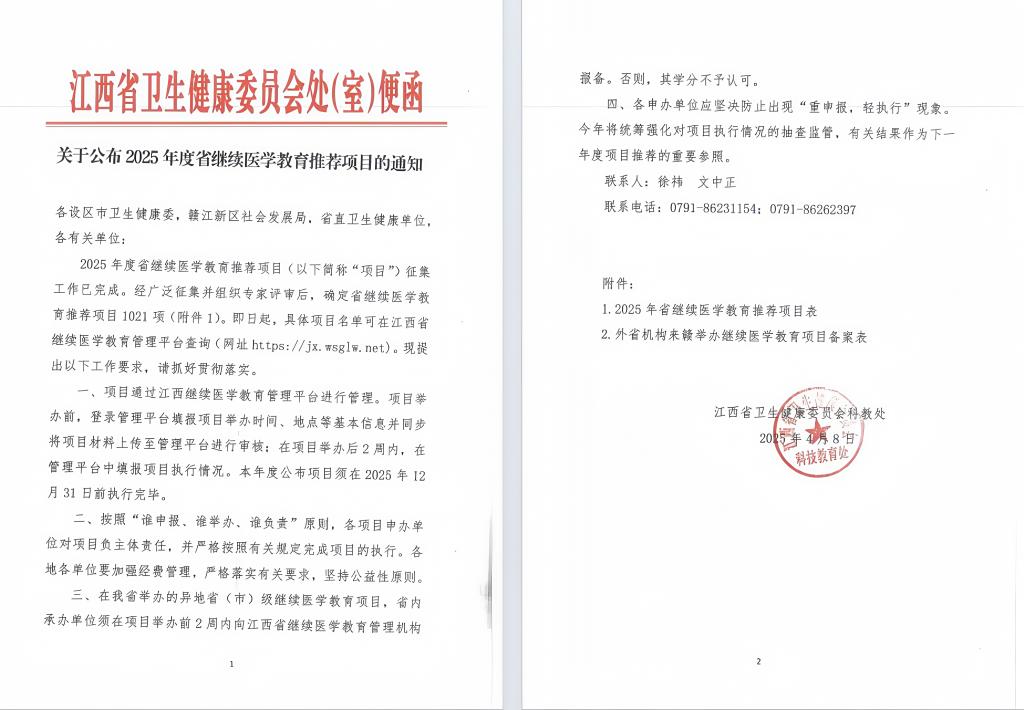 近日,江西省卫生健康委员会科教处印发了《关于公布2025年度省继续医学教育推荐项目的通知》,经个人在线填报,医院及江西省卫生健康委员会科教处审核,井冈山大学附属医院获批9项2025年度省继续医学教育推荐项目。(文图:王厚鹏 审核:刘昱昕 周臻 彭晓露)