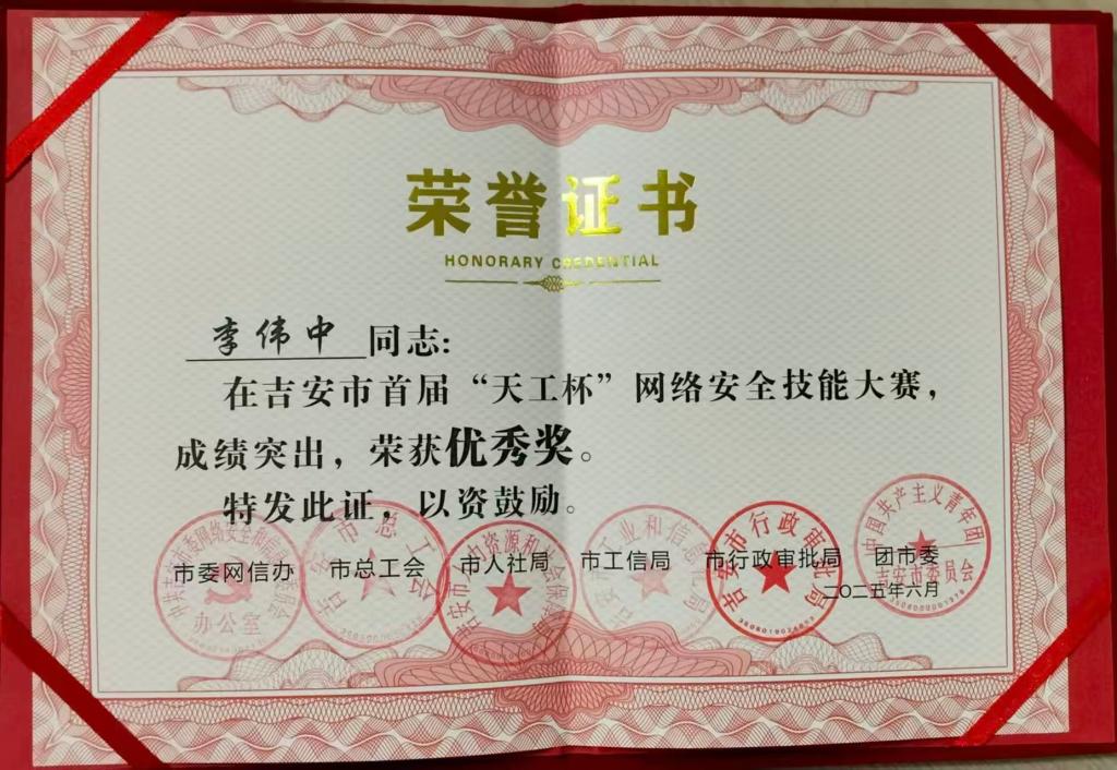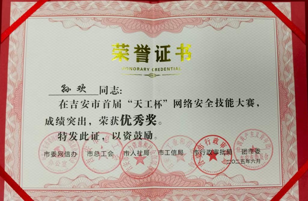 2025年6月25日,为充分挖掘各地各单位网络安全人才资源,由市委网信办、市总工会、市人社局、市工信局、市行政审批局、团市委等6部门联合主办的首届“天工杯”网络安全技能大赛决赛顺利落幕。井冈山大学附属医院信息技术科梁立、李伟中、孙欢三位同志组建名为“九天揽月”参赛队代表医院参加本次比赛。