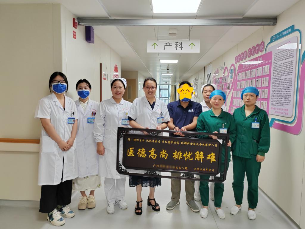 近日,谭女士的父亲和丈夫满怀感激来到科室,送上一面写有“医德高尚,排忧解难”的牌匾。患者爱人紧紧握着傅帆副主任、李红英护士长的手,激动地说:“感谢妇产科团队和所有兄弟科室,把我爱人从鬼门关拉了回来,给了我们完整的家!”令人暖心的是,家属还帮忙安装好了牌匾。