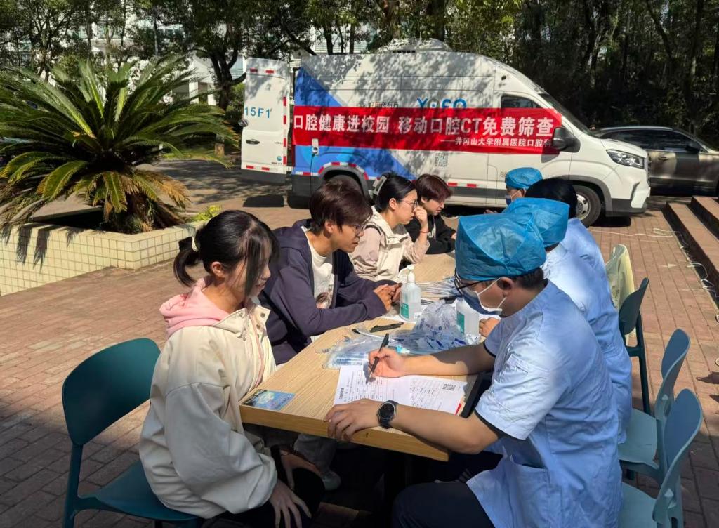 上午,义诊在学校南区第一食堂门口启动。由副主任医师胡静、主治医师文紫蓉等组成的专业团队,借助移动口腔CBCT车,为学生提供一对一口腔健康检查,全面评估牙齿、牙龈状况。对需影像检查的学生,现场免费拍摄CBCT并即时阅片分析,让学生当场了解口腔问题、获取治疗建议。医护人员还耐心解答疑问,科普正确刷牙、牙线使用及定期口腔检查的重要性。