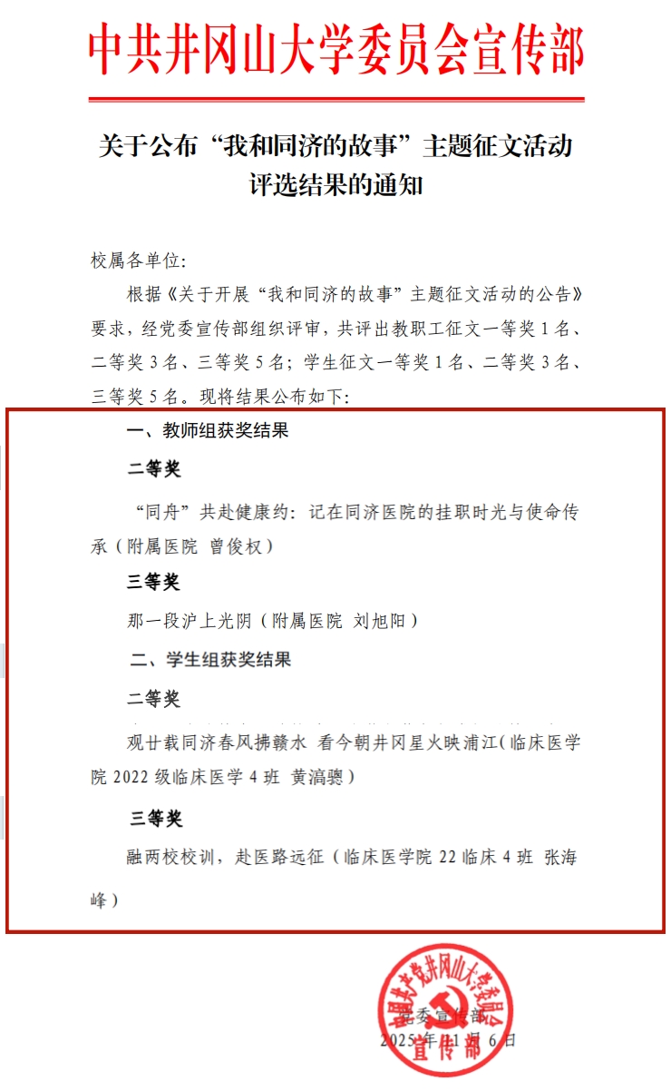 近日,中共井冈山大学委员会宣传部公布了“我和同济的故事”主题征文活动的评选结果,井冈山大学附属医院(临床医学院)师生在此次活动中表现优异,荣获多个奖项,充分展现了与同济大学及其附属医院的深厚情感。