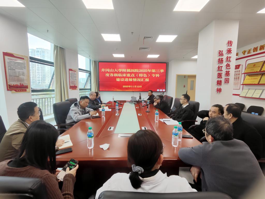 11月12日下午,井冈山大学附属医院召开2025年第三季度临床重点(特色)专科建设工作汇报会。院党委委员、副院长韦华璋出席并讲话,各级临床重点专科、特色专科主任和专科秘书参会,医务科副科长王非非主持。