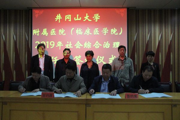 最后,设备科科长邹越非、心胸外科主任蔡其桂作为各科代表上台与院领导一同签订了井冈山大学附属医院(临床医学院)2019年社会综合治理责任书。