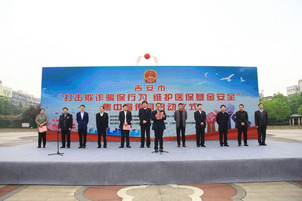 启动仪式上,宣读了《打击欺诈骗保行为,维护医保基金安全倡议书》,定点医疗机构、定点药店代表宣读了承诺书,主席台各领导齐手共同开启了吉安市“打击欺诈骗保行为、维护医保基金安全”活动。启动仪式现场相关机构设置了活动宣传展板和医保政策、医药健康咨询台,现场解答群众疑问,并向群众发放海报和折页等宣传材料。