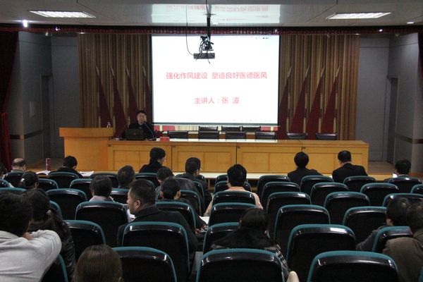为深入学习宣传贯彻党的十九大精神和全省作风建设工作会议精神,切实以习近平新时代中国特色社会主义思想指导医院(学院)的作风建设,塑造良好的医德医风,进一步带动全院上下提振精气神、汇聚正能量,2018年11月14日下午,院党委书记张波在临床医学院图书馆六楼学术报告厅,为全院中层以上干部及全体党员上了一堂题为《强化作风建设 塑造良好医德医风》党课。