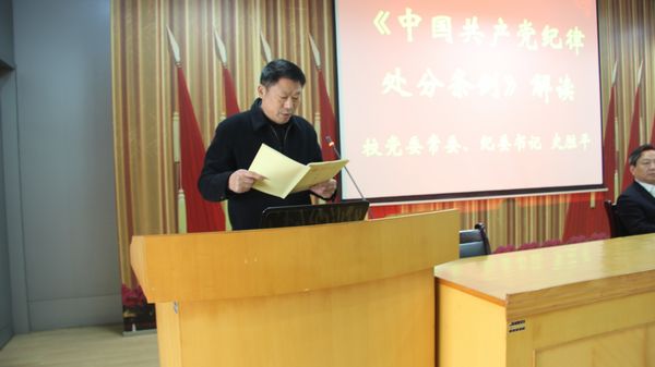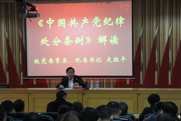 为全面贯彻习近平新时代中国特色社会主义思想和党的十九大精神,落实新时代党的建设总要求、全面从严治党战略部署和全省作风建设工作会议精神,进一步推动我院广大党员学习好、宣传好、贯彻好《中国共产党纪律处分条例》精神,2018年11月24日上午,医院党委特邀校党委常委、纪委书记史胜平为我院中层以上干部及全体党员作新修订的《中国共产党纪律处分条例》解读。