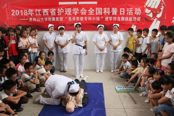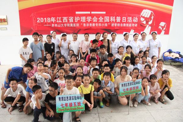 9月21日下午,2018年江西省护理学会全国科普日活动期间,我院护理“急诊急救专科小组”走进吉安市青原区思源实验学校为在校初一的学生讲解急救知识,开展自救技能培训,共一百余名学生参加。