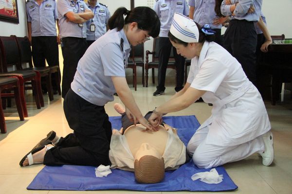 7月23日上午,护理部主任肖瑾瑛带领急诊科护理人员一行5人前往吉安市看守所,为看守所的狱警讲解心肺复苏的要领及操作技能,帮助他们掌握这项急救技能。