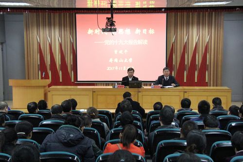 曾建平以《新时代、新思想、新目标——党的十九大报告解读》为主题宣讲十九大精神,他首先回顾了党的十九大盛况和十九大召开的背景,然后从党的十九大的主题和意义、中国特色社会主义进入新时代、习近平新时代中国特色社会主义思想、新时代中国特色社会主义奋斗目标等方面,对党的十九大精神进行了系统阐述和深入解读,并结合十九大报告和党章的有关修改对一些特殊词作出了梳理和分析。