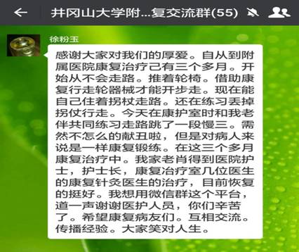 一个偶然的机会老伴得知井冈山大学附属医院康复科治疗效果好,家人都劝我不要放弃自己,我当时就抱着试一试的心态办理了入院手续。一到科室,我的主治医师、责任护士和康复治疗师就非常热情地迎接了我,并为我制订了详细的、个性的康复计划,每天都进行针炙、理疗、康复训练、康复指导等一系列的治疗,期间我产生过放弃的念头,是医生、护士和家人们的不断鼓励、照顾,让我坚持下来了。