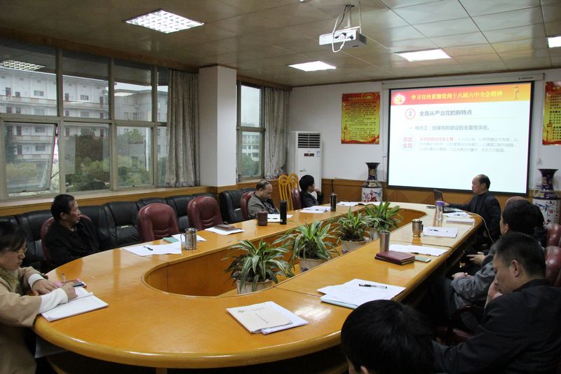 肖游章结合十八届六中全会向大家讲述了十八届六中全会的主题、全面从严治党的新部署及全面从严治党的新特点,并号召大家会后认真学习十八届六中全会的内容和会议精神。十八届六中全会的主题为坚定推进全面从严治党,坚持思想建党和制度治党紧密结合,集中整饬党风,严厉惩治腐败,净化党内政治生态。全面从严治党的新部署包括:确立一个核心,正式确立习近平同志为全党的核心,为全面从严治党提供根本保证;审议通过两个文件——《关于新形势下党内政治生活的若干准则》和《中国共产党党内监督条例》;抓住三个关键,新形势下加强和规范党内政治生活,重点是各级领导机关和领导干部,关键是高级干部特别是中央委员会、中央政治局、中央政治局常务委员会的组成人员。高级干部特别是中央领导层组成人员必须以身作则,模范遵守党章党规,严守党的政治纪律和政治规矩,坚持不忘初心、继续前进,坚持率先垂范、以上率下,为全党全社会作出示范;增强四种意识,全党要牢固树立政治意识、大局意识、核心意识、看齐意识,坚定不移维护党中央权威和党中央集中统一领导,继续推进全面从严治党,共同营造风清气正的政治生态;切实做好五项工作,思想理论准备工作、组织准备工作、经济社会发展工作、意识形态工作、维护社会稳定工作。全面从严治党的新特点有:一、体现了共产党人的历史担当,二、制度治党的思路明确清晰,三、加强党的建设的全面性突出,四、管党治党的从严力度较大,五、党建思路传承性明显,六、具有强烈的问题意识,七、形式与内容表现出了务实风格。