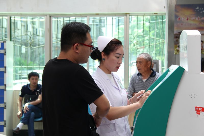 导诊台护士王晶晶耐心指导患者使用建卡、挂号、充值、缴费一体机