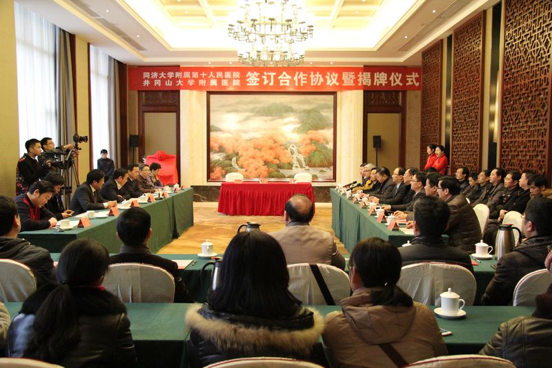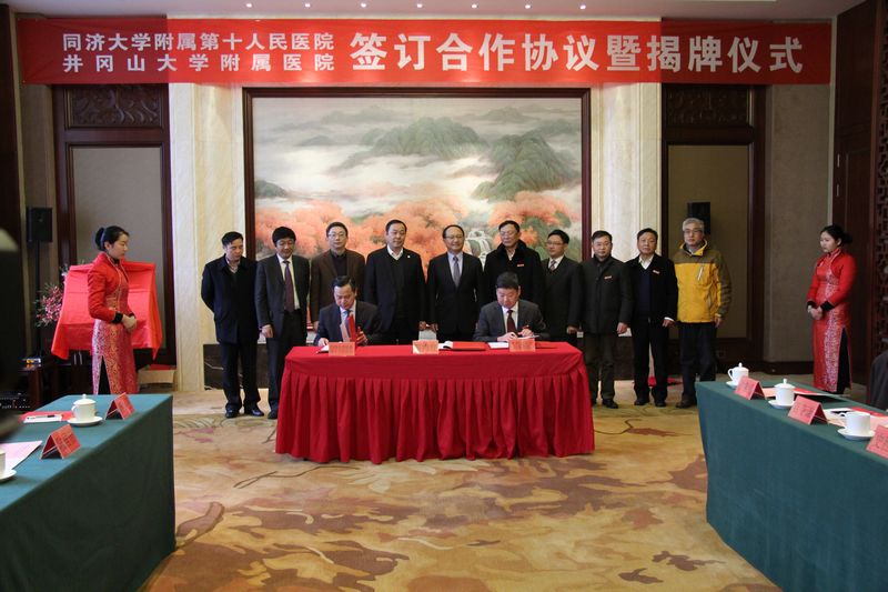 1月29日下午,同济大学附属第十人民医院和井冈山大学附属医院签订合作协议暨揭牌仪式在吉安宾馆隆重举行。同济大学党委书记杨贤金、吉安市市长王少玄、井冈山大学党委书记彭涉晗、井冈山大学校长曾建平、吉安市副市长左继生、吉安市卫计委副主任梁志明、井冈山大学校长助理苗夺谦、同济大学附属第十人民医院院长秦环龙等出席仪式,校纪委书记史胜平主持。仪式中,杨贤金、曾建平、秦环龙分别讲话,秦环龙和井冈山大学附属医院院长曾常爱分别代表双方签订合作协议。井冈山大学附属医院同时挂牌同济大学附属第十人民医院分院,杨贤金、王少玄、彭涉晗、秦环龙共同为同济大学附属第十人民医院分院揭牌。同济大学有关部门负责人、同济大学附属第十人民医院有关负责人及部分科室负责人、井冈山大学附属医院院班子成员及相关科室负责人等参加了仪式。