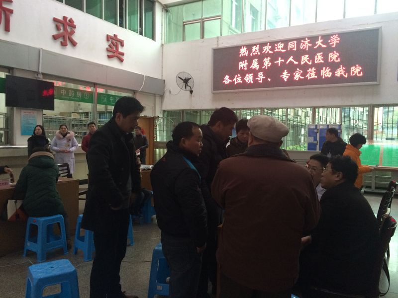 仪式进行中,同济大学附属第十人民医院五位专家在井冈山大学附属医院门诊大厅内举行义诊,并深入各科室考察指导。