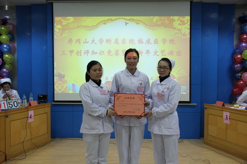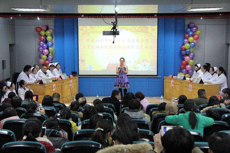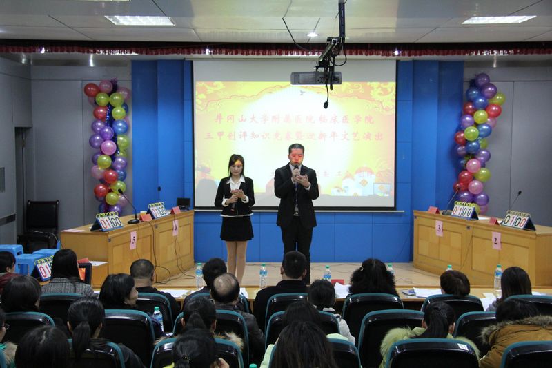 目前,我院三甲评审已进入关键的冲刺阶段,为帮助全院职工有效掌握“创评”应知应会知识,强化执行力,积极做好迎评准备,确保我院三甲评审顺利通过及迎接2016年的到来,12月30日晚,在临床医学院图书馆六楼会议室,医院团委、工会、创评办联合举办了三甲创评知识竞赛暨迎新年文艺演出,党委书记肖游章致开幕辞,院领导、各部门科室人员参加。比赛决出了团体一、二、三等奖,其中,由机关第一党支部及内科第三党支部成员组成的第二竞赛小组以优异的成绩夺得冠军。