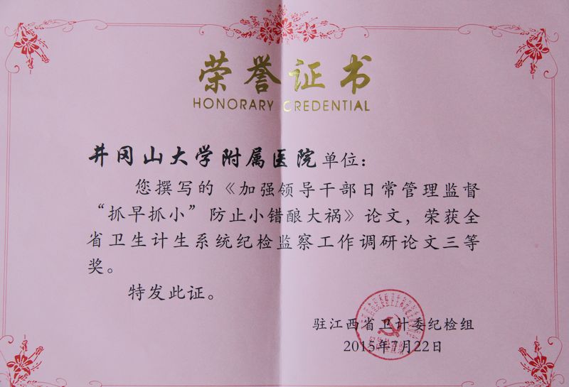 7月30日,在全省卫生计生系统纪检监察干部业务培训班暨召开党风廉政重点工作推进会上,针对上半年全省卫生计生系统纪检监察工作和“红包”整治情况,我院得到省卫计委的重点表扬;会议上对“三转”专题优秀调研论文颁发了证书,我院纪检监察室提交的《加强领导干部日常管理监督,“抓早抓小”防止小错酿大祸》获得三等奖。(纪检监察室 周剑琴)