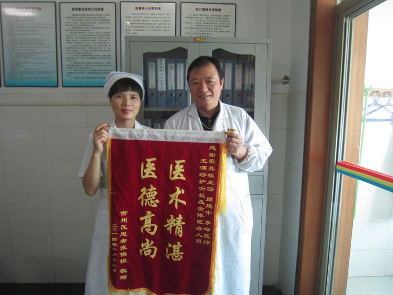 2014年10月12日,经我院治疗后顺利出院的患者张保根老人为我院胸外科全体医护人员送来了“医德高尚 医术精湛”的锦旗,以感谢他们在其住院期间对他进行的精心治疗和照顾。现年72岁的张保根老人,2003年因食管癌进行了食管癌根治术,手术顺利,术后恢复较好。但在2014年9月中旬突然出现无明显诱因下的咯血,为了查明病因,尽快得到治疗,遂来我院就诊,经检查,被确诊为(颈部)低分化鳞状细胞癌。我院胸外科蔡其桂主任为其精心制定了诊疗方案,在进行了为期半个月的放疗之后,病情得到了有效的控制,身体状况大为好转。住院期间,我院医护人员除了对其采取积极的放射性治疗之外,还从心理上安慰病人、鼓励病人,增强其战胜癌症的信心。出院前蔡其桂主任又详尽地嘱咐病人出院后的各种注意事项。出院后,患者恢复情况良好,为了表示对蔡其桂主任、周建中医师、李峰医师、王满珍护士长及全体医护人员的感谢,特向他们送出了“医德高尚 医术精湛”的锦旗。