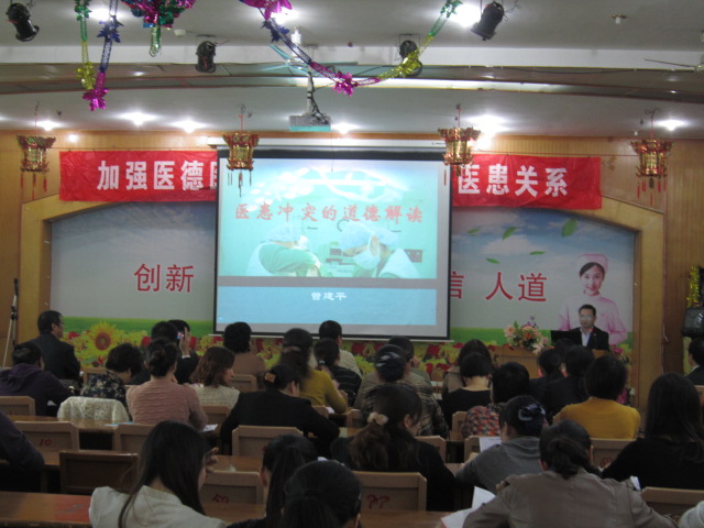 曾建平副校长通过列举近年来医患冲突的典型案例,并结合自己多年的研究成果,从当前我国社会的主要道德问题、当前我国医护职业道德主要问题、影响医患关系的主要因素、如何构建和谐合理的医患关系等方面进行了精彩解读,并就构建和谐医患关系提出了针对性很强的思路和建议。讲座内容贴近医院实际、逻辑严密、富含哲理,观点、论据、案例深入浅出、数据翔实,曾校长风趣幽默的谈吐、渊博睿智的学识,都让大家深受启发和教育,获益匪浅。