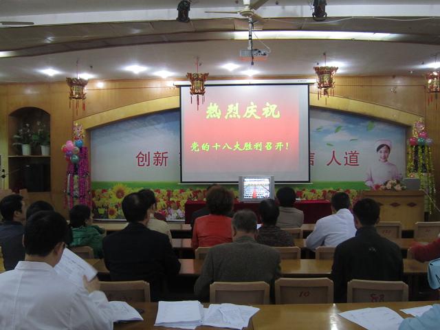 举世瞩目的中国共产党第十八次全国代表大会于2012年11月8日召开。院长曾常爱、副院长司小刚、党委副书记罗美华、王政华等院领导及各党支部书记、党员及职能科室工作人员在医院八楼会议室集中观看了十八大开幕式。