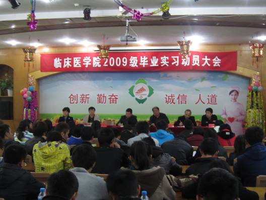 为保证医学毕业实习工作顺利开展,提高毕业实习质量,11月22日,临床医学院在附属医院八楼会议室召开了2009级临床医学、中医本科专业实习动员大会,院领导曾常爱、司小刚、邹亦平、罗美华、曾晓元、王政华出席大会,各系部老师、教务科工作人员、各实习班班主任及实习生200余人参加。会议由党委副书记王政华主持。