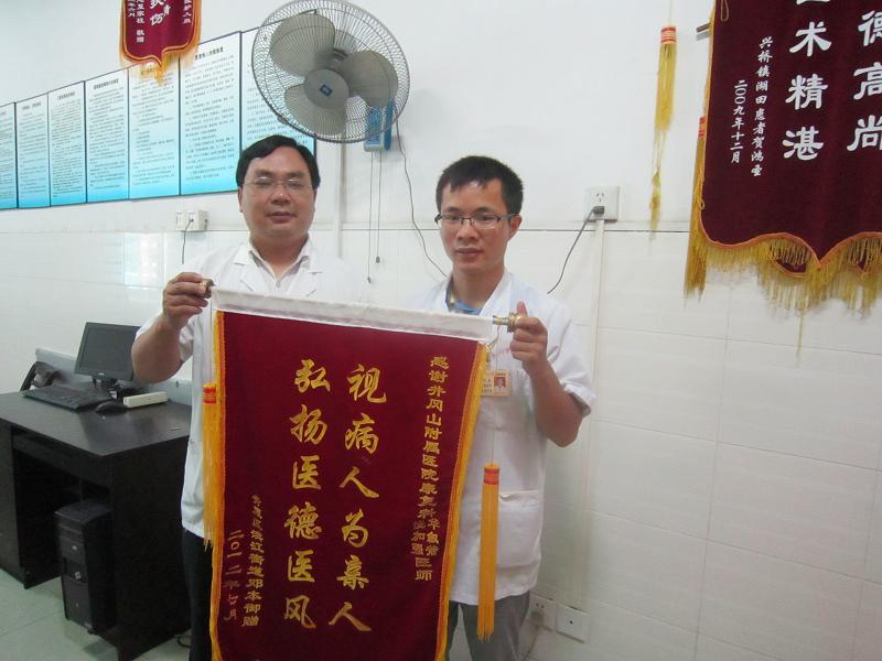 患者邓本御,男,47岁,因脑出血致右侧肢体不能活动并言语不利而入我院行康复治疗。入院时,患者由轮椅推入病房,右上下肢活动障碍,日常生活不能自理,言语模糊不清。经我院康复医学科华叙箭主治医师、饶加强康复治疗师的精心治疗及康复科护理部的细心护理,行康复治疗后,患者现已能自行单独行走,言语功能已恢复正常,左上肢功能较前改善,日常生活大部分自理,现患者仍在康复医学科继续行康复治疗。患者及家属对我院康复医学科的医护人员深表感谢,并送来感谢锦旗。