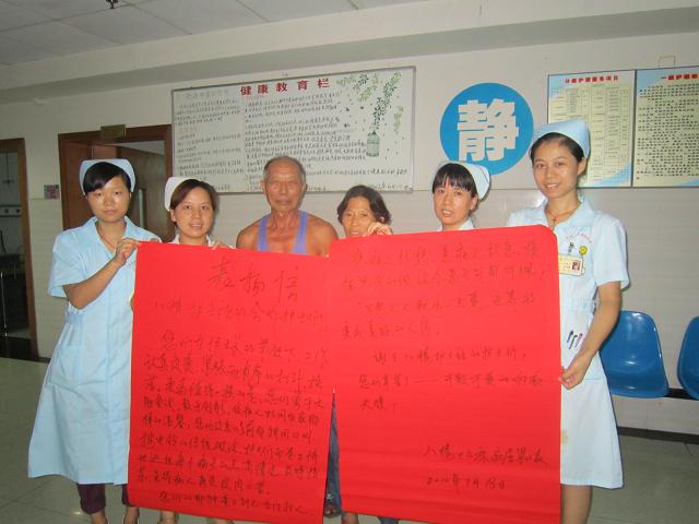 您们在护士长的带领下,工作认真负责,紧张而有序地打针、换药,更为值得一提的是,您们勇于大胆尝试,敢于创新,使病人如同在家那样的温馨。您们改变了以前那种用口叫、按电铃的传统做法,护士们而是不停地巡视着每个病号的点滴情况,及时换药,免得病人再受皮肉之苦。