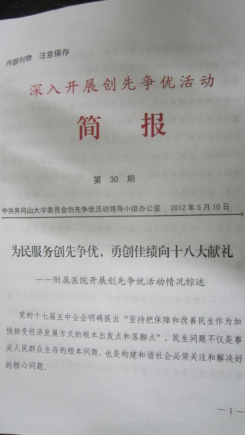 井冈山大学附属医院在学校党委、行政的正确领导下,坚持以邓小平理论和“三个代表”重要思想为指导,深入贯彻落实科学发展观,弘扬井冈山精神,充分发挥党组织的政治核心和共产党员的先锋模范作用,深入开展为民创先争优活动,勇创佳绩向党的十八大献礼。医院13个党支部和137名党员都应立足岗位本职岗位创先争优,从解决人民最关心、最直接、最现实的利益问题入手,多为利民之举,多打利民之基,多办利民之事,通过进基层——开展医疗义诊与医疗支援活动;保健康——开展与企业家结对服务活动;献爱心——开展走访慰问送温暖活动;促和谐——开展矛盾纠纷大排查;听建议——组织群众座谈调研五类活动,全力保障群众健康,推进了医院各项事业健康快速发展。