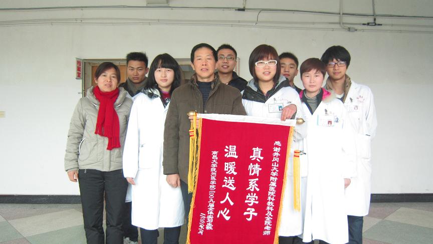 1月6日上午,南昌大学抚州医学院2009届全体实习生送来锦旗,对实习期间得到我院的细心教导表示万分感谢。
