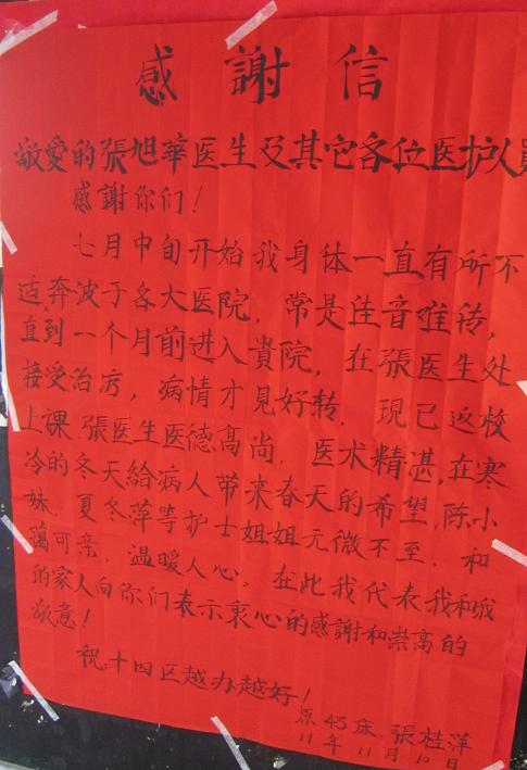 七月中旬开始,我身体一直有所不适奔波于各大医院,常是佳音难传,直到一个月前进入贵院,在张医生处接受治疗,病情才见好转,现已返校上课。张医生医德高尚、医术数精湛,在寒冷的冬天给病人带来春天的希望,陈小妹、夏冬萍等护士姐姐关照无微不致,和蔼可亲、温暖人心。在此我代表我和我的家人向你们表示衷心的感谢和崇高的敬意!