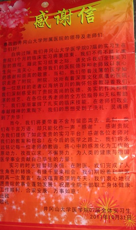 井冈山大学医学院2007届全体实习生送来感谢信,信中表达了他们对医院精心培育的感激之情。他们表示,毕业后将会为人民群众的健康和医学事业的发展做出积极贡献。