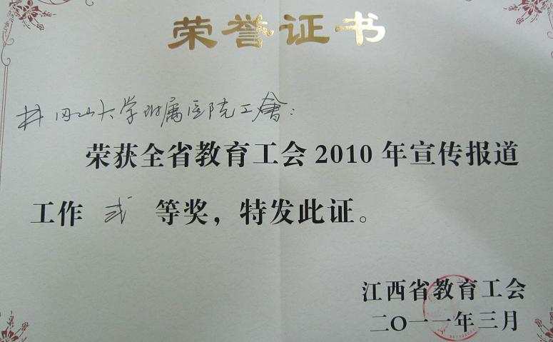 3月1日,江西省总工会下发《江西省教育工会关于表彰全省教育工会2010年宣传报道工作先进单位的决定》(赣教工〔2011〕6号)文件,正式授予我院“2010年宣传报道二等奖”。