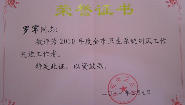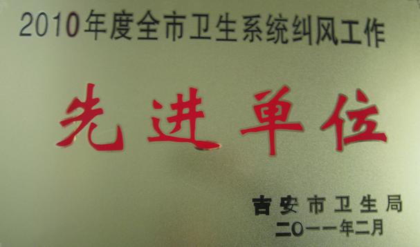 近日,吉安市卫生局授予我院“2010年度全市卫生系统纠风工作先进单位”,授予我院监察室副主任罗军同志“2010年度全市卫生系统纠风工作先进工作者”称号。