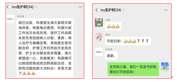 2020年1月23日10时起武汉封城,一场史无前列的人类与病毒的战疫就此展开,与以往战争不同,此次战疫的主力军是身穿白衣的医护人员。一方有难,八方支援,全国各地医护人员前赴后继,日夜奋战救治患者。疫情就是命令,1月26日下午4点医院接到江西省卫健委征调第一批援鄂战疫医疗队的通知,4小时完成人员调集和物品准备,于晚上8点ICU韦华璋主任和男护谢奕亮与医院同事匆匆踏上驰援武汉的道路。韦华璋主任在赴前线的路上心系科内工作,向全科医护人员发了一则科内工作安排的消息,方全凤护士长回复:我们一定会守好家,等你们平安回来!