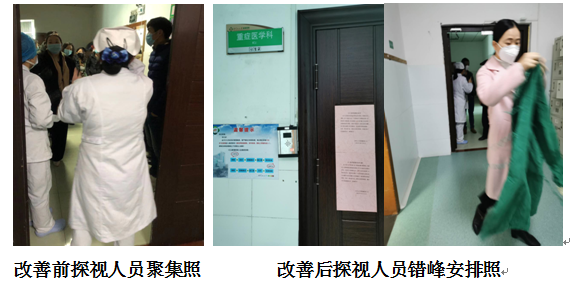 再次,做好家属探视工作。众所周知,每年过年ICU病人是最多的时候,探视家属人数就会相应增加,每天到了探视时间,家属聚集在科室门口,容易传播新冠肺炎。院领导和职能部门非常重视探视家属管理,亲自到科室指导,方全凤护士长迅速组织医护人员讨论如何做好家属管理,制定了ICU家属探视防控新冠肺炎流程,并在大门口粘贴ICU患者家属告知书。病人入科时由医生询问家属流行病学史,并告知:控制探视的目的,每日限一位家属探视和沟通病情,护士错峰安排探视人员,前一天告知家属第二天探视时间,对入室人员进行体温监测和信息登记,指导洗手、戴口罩、帽子,结束探视由医生与家属沟通完病情离室后,紫外线消毒医生办室。执行上述流程后科室门口安静多了,病人和家属安全了,病房工作更有序了,医护人员也更满意了。