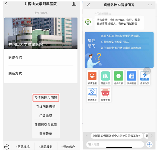 根据江西省卫生健康委员会赣卫医函【2020】31号文件《转发国家卫生健康委办公厅关于在疫情防控中做好互联网诊疗咨询服务工作的通知》附件中有关“智能辅助新型冠状病毒肺炎问诊量表及判断逻辑说明”,我院作为吉安市首家医院,实现智能辅助疫情问答功能。