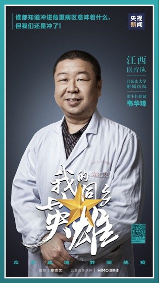 我院援鄂医生、ICU主任韦华璋自1月26日踏上抗疫的征程以来,一直在抗疫的最前线工作,已经在湖北武汉度过了50多个日夜。近日,他作为江西医疗队的成员登上了《江西画报》《央视新闻》的“抗疫”专刊页面,代表了江西抗疫医务人员形象。他曾说过:“谁都知道冲进危重病区意味着什么,但我们还是冲了!”他现在在武汉的工作日常,也正是这句话的真实写照了,也是很多和他共同战斗的医务人员的真实写照,向他们致敬。