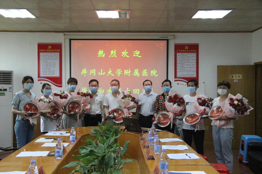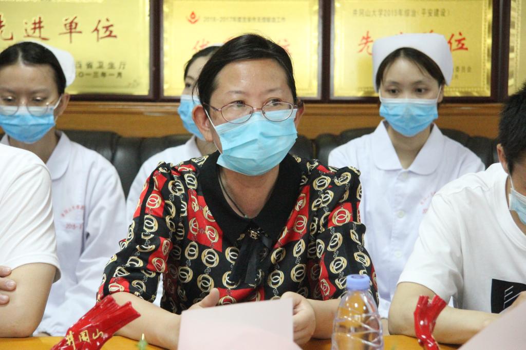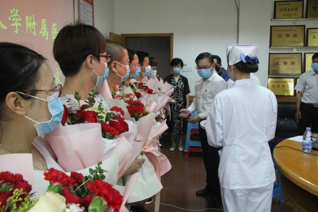 5月6日上午,我院援鄂医疗队员韦华璋、高雪萍、杨群、谢奕亮、康云、章小丹、王婷,经过一段时间的休整,即将重回原工作岗位继续工作,校党委副书记、校长曾建平,校党委常委、副校长黄俭根,校党委常委、宣传部部长李裕福,校党委统战部部长、党委(校长)办公室主任肖洪海一行来我院看望慰问他们,为他们献花、赠送纪念品,并在临床医学院行政楼三楼会议室举行了座谈会,院领导及科室主任参加。