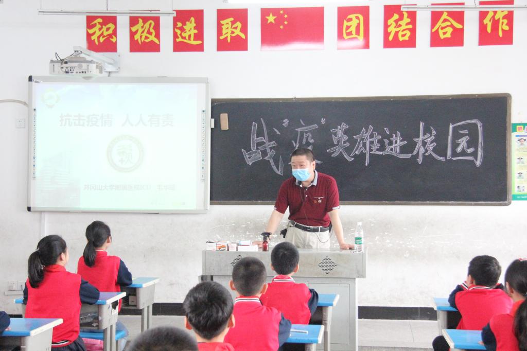 5月20日上午,根据活动安排,我院抗疫英雄、ICU主任韦华璋来到吉州区长塘中心小学,为四(1)班的师生们带来了一场精彩的讲课,传递正能量。他以《抗击疫情、人人有责》为题,与在场的师生分享了自己出征武汉的历程,在武汉奋战的岁月,抗疫期间发生的点滴故事及抗疫归来后感受。他朴实无华的讲述,也感染了在座的每一位师生,在场人员犹如身临其境般与他一起回顾了那段艰难而充满斗志的日日夜夜。谈及感受,他表示惟愿山河无恙,国泰民安,感谢武汉的同道和百姓、政府,别把自己当救世主,就是持平常心,做份内事,每个人只要做到正直、诚实、友善、敬业,那么你对社会就有所贡献;抗击疫情与英雄主义无关,我们只是践行医者使命,彰显济世情怀。 最后,他还向师生们普及了新冠状病毒的相关知识,包括新冠状病毒的传播途径、防控手段等等,还亲身向学生们示范如何正确佩戴口罩及洗手,并激励学生们热爱祖国、珍惜时光、勤奋学习,做一个对社会有贡献的人。