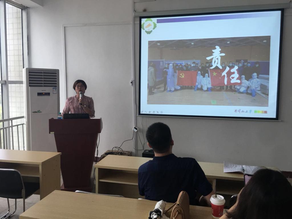 专题讲座第一场,邀请我院援鄂抗疫医务人员ICU杨群同志讲述抗疫英雄事迹。在国家和民族最危急的时刻,杨群同志舍小家为大家,奔赴抗“疫”第一线,抗疫期间她用自己的行动为大家诠释了作为一名共产党的使命和担当。