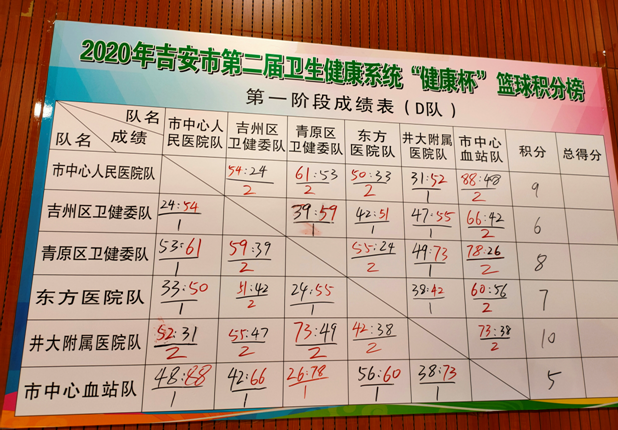 本届篮球赛是全市卫生健康系统的一次体育盛会,来自各县(市、区)卫健委、市直卫生健康单位等共22支球队参加。我院男子篮球队借此契机,发扬团结向上、顽强拼搏、永不言弃的战斗精神,在小组赛连克东方医院、吉州区卫健委、市中心血站、青原区卫健委、市中心人民医院,以小组第一的战绩出线,顺利挺进八强,并在10月22日下午八进四的比赛中,战胜吉安市妇幼保健院队,成功晋级四强。