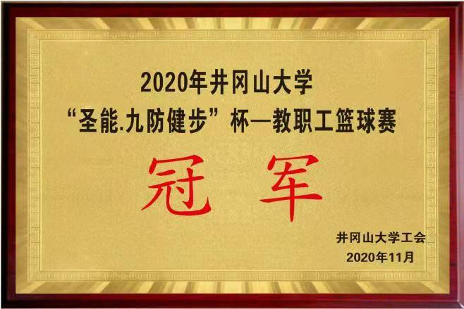 2020年井冈山大学“圣能.九防健步”杯全民健身—教职工篮球比赛于11月12日星期四下午正式开赛,参赛的共有18个学院代表队,历经44场11天的比赛,我院奋勇拼搏以小组第一出线,在11月26日决赛中,与机电工程学院的激烈比赛中,我院以52—40的比分赢得比赛,这是我院篮球队在井冈山大学教职工篮球赛中首次夺得冠军奖杯。(篮球队)