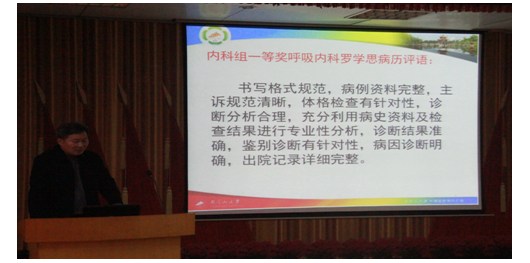 接下来伍忠根副院长对病历评比大赛进行了总结。他从比赛组织情况、获奖病历情况、各科室平均分排名、存在的问题、部分典型案例展示、获奖病历专家评语展示这六个方面进行总结。强调,医院病历评比工作小组要认真总结本次病历评比大赛的经验,力争将病历评比工作常态化,不断改进工作方式和评比标准,以评促改,进一步规范病历书写行为,调动临床医师的积极性,以达到持续改进病历内涵质量、保证医疗质量安全的目的。