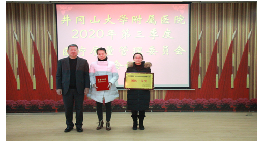 会议首先表彰了在第三季度病历质量评比大赛、传染病防控技能大赛中获奖的团体及个人。获奖选手代表曾克非及罗学思相继发表了获奖感言。他们纷纷表示,要将这份荣耀化作井冈山大学附属医院为人民服务长征路上的动力,不忘初心,牢记使命,为人民健康贡献自己的力量。