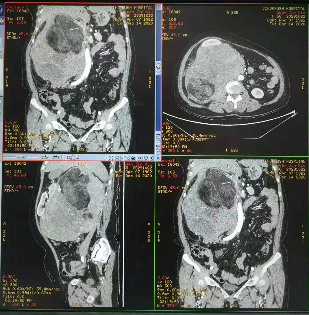 患者管某,女,58岁,右侧腰部胀痛不适3个月,右侧腰腹部触及巨大隆起性包块,腹部好似中晚期妊娠,外院CT检查提示右侧腹膜后巨大肿瘤,为进一步诊治遂入我院。完善系统检查,CT和血管重建显示右侧腹膜后巨大恶性肿瘤,与右肾、肾上腺分界不清,肿瘤越过中线严重压扁下腔静脉,推压腹主动脉和十二指肠,肿瘤上极挤压肝胆重要解剖结构。患者同时伴有高血压、阵发性室上性心动过速病史,考虑病情十分复杂,分管院领导伍忠根副院长高度重视患者病情,亲自参加并组织普外科、血管外科、肿瘤科、放疗科、影像科、麻醉科、重症医学科、病理科、妇产科、心内科、超声科等专家行肿瘤疑难病多学科会诊(MDT),讨论研究患者病情及治疗方案,最终MDT会诊一致认为诊断考虑为腹膜后巨大恶性肿瘤,脂肪肉瘤和纤维肉瘤可能性大,必须尽快手术切除肿瘤,并共同制定了周密的手术计划。2020年12月21日井冈山大学附属医院挂职副院长刘飞博士在肖文兴主任、江山和刘臻伟副主任医师密切配合下,顺利为患者实施经腹腔右侧腹膜后巨大肿瘤切除术,术中见巨大肿瘤占据整个腹腔,紧贴肝胆肾和下腔静脉等大血管,既要保护周围脏器不受损伤和病人安全,又要保证肿瘤完整切除,历经几个小时的战斗,成功拆除了这个巨大的“炸弹”(大小26*22*12cm,重量3.18Kg),术后病理:去分化脂肪肉瘤,现患者已康复出院。