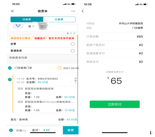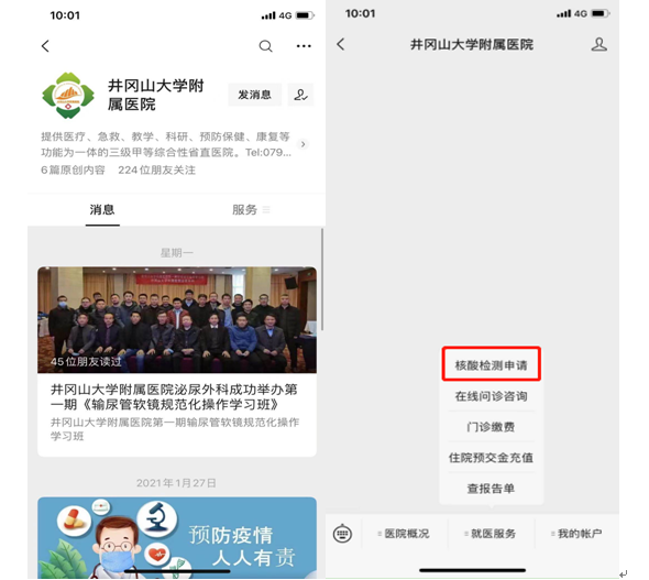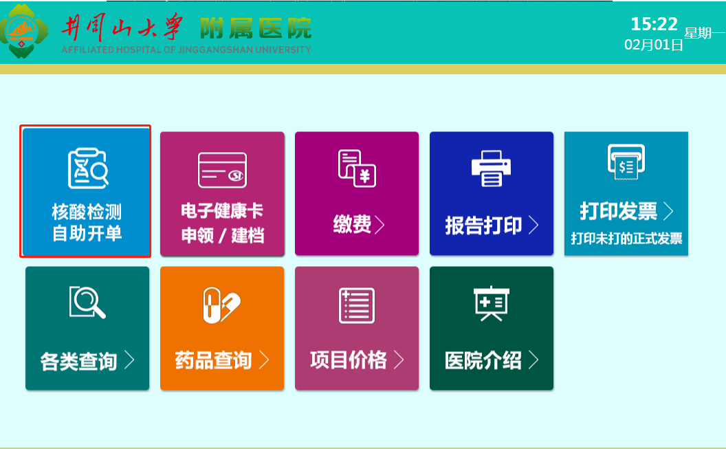 门诊常规核酸检测者和住院陪护人员可通过关注井冈山大学附属医院官方微信或医院自助机进行自助开单、在线支付,再也不用找医生开单、更不用到窗口交费!
