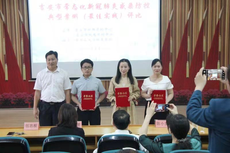 黄小新(图左二)荣获吉安市常态化新冠肺炎感染防控典型案例(最佳实践)评比二等奖,改善主题为提高住院患者陪护制度的执行率