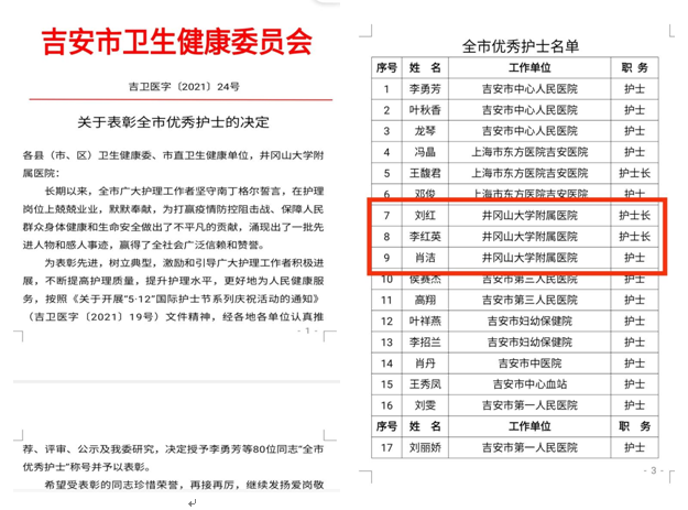 刘红护士长、李红英(小)护士长、肖洁获吉安市优秀护士荣誉称号