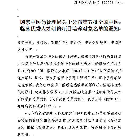 根据国家中医药管理局《关于公布第五批全国中医临床优秀人才研修项目培养对象名单的通知》(国中医药人教函〔2022〕1号),我院钟丹主任中医师以全省第一名的成绩获评第五批全国中医临床优秀人才研修项目培养对象。